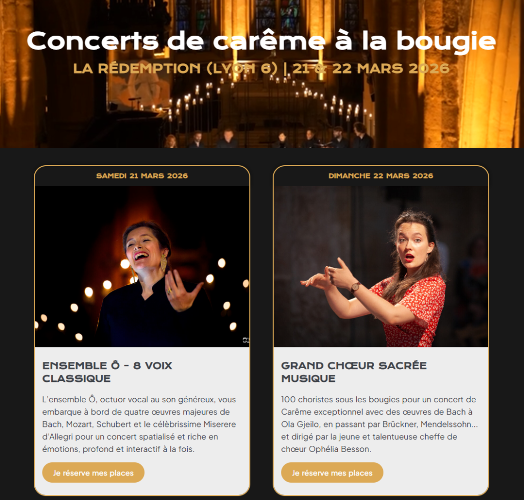L’AAOR s’associe à cet événement, fidèle à son attachement à la beauté spirituelle et au patrimoine musical sacré. À cette occasion, Denis Bordage, organiste titulaire, interprétera deux pièces au programme et accompagnera le Cantique de Jean Racine de Gabriel Fauré. Le premier concert sera donné par l’Ensemble Ô, octuor vocal professionnel dirigé par Laëtitia Corcelle, dans un programme participatif autour du Miserere d’Allegri et d’autres grandes pages chorales. Le second concert réunira un grand chœur éphémère de 80 choristes, dirigé par Ophélia Besson, jeune et talentueuse cheffe de chœur lyonnaise, dans un programme de Carême a cappella, de Bach à Mendelssohn, en passant par Bruckner et Arvo Pärt.